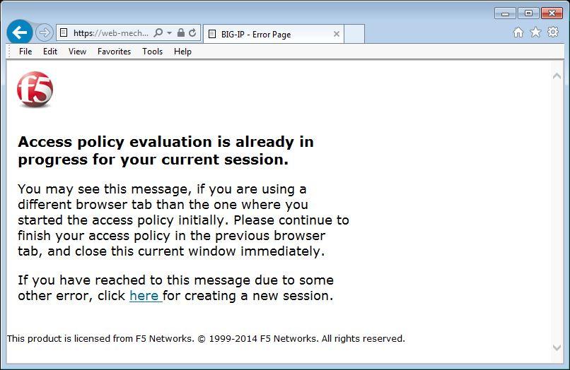 After I click through the warning screen I am presented with Access Policy Evaluation is already in progress for your current session and offered a link to create new session which just loops me back to the warning screen. F5s Access Policy Manager APM is a secure flexible and high-performance access management proxy solution. This release corrects the.